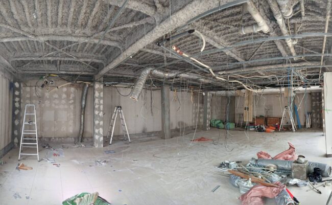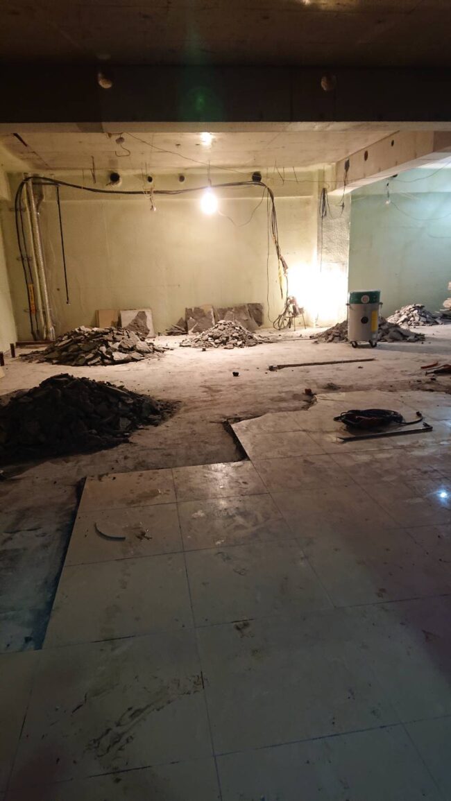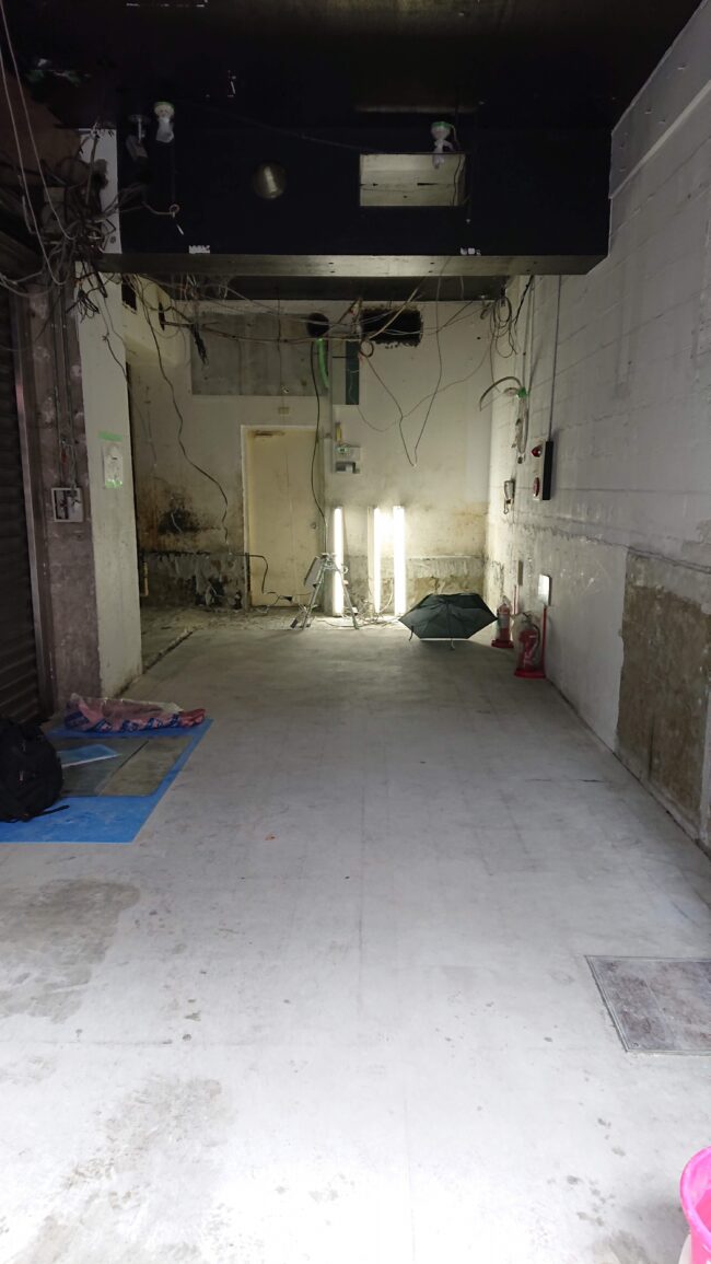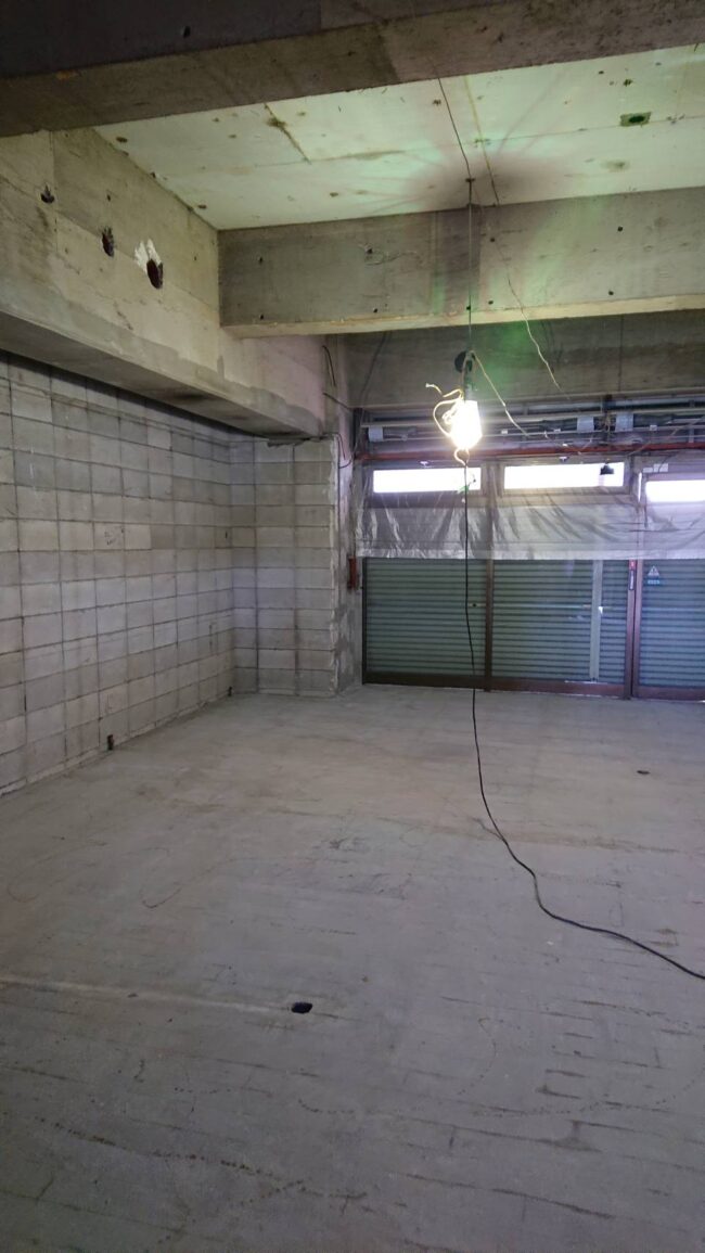 【8月19日~23日】 ・サイン撤去 ・造作物解体 ・下がり壁解体 ・駐輪場天井解体 ・キッチンフード撤去 ・什器類解体 ・天井配線撤去 【8月24日・25日】 ・キッチン土間斫り ・駐輪場ダクト落とし &…