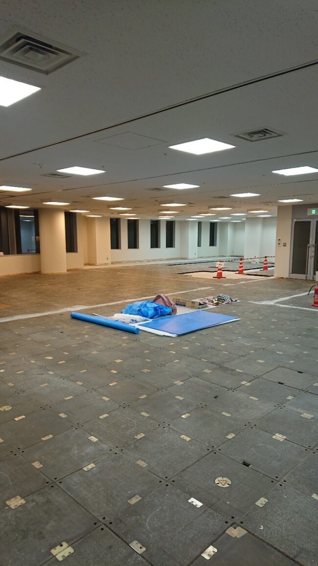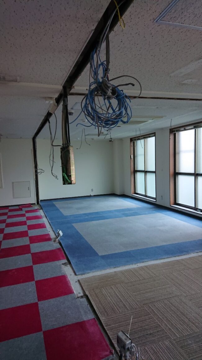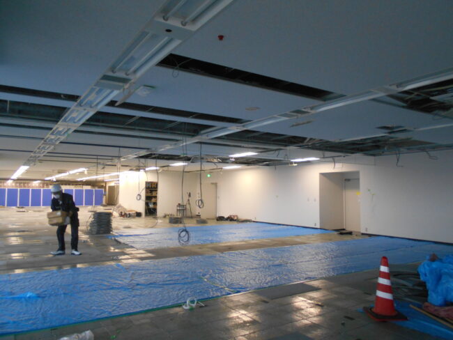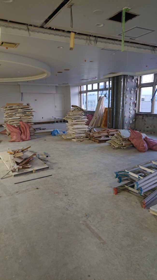 【10月7日】 ・各所養生 ・天井部分撤去 ・各所集積及び清掃 【10月8日】 ・天井下地解体 ・天井開口 ・カーテン養生 ・各所集積及び清掃 【10月17日】 ・パーテーション撤去 ・EV養…