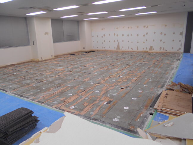 【11月9日】 ・間仕切解体 ・壁面造作撤去 ・床シート、ベニヤ解体 ・各所養生 ・各所集積及び清掃 【11月10日】 ・OA床解体 ・糊スクレーパー掛け ・巾木撤去 ・ふかし壁撤去 ・天井部分開口 ・天井…