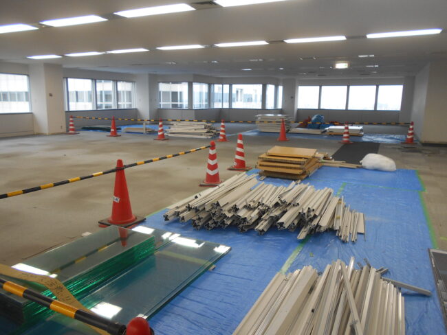 【5月7日】 ・共用部通路養生 ・ガラスパーテーション解体 ・各所集積及び清掃 【5月9日】 ・パーテーション解体 ・各所集積及び清掃 【5月10日】 ・解体材小切り ・巾木撤去 ・雑工事 ・…