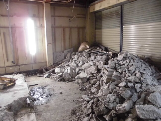 【10月16日】 ・壁周り解体 ・天井一部解体 【10月17日】 ・土間斫り 【10月18日】 ・土間斫り ・AC撤去 ・2階 絨毯撤去 【10月19日】 ・シャッター撤去 ・看…
