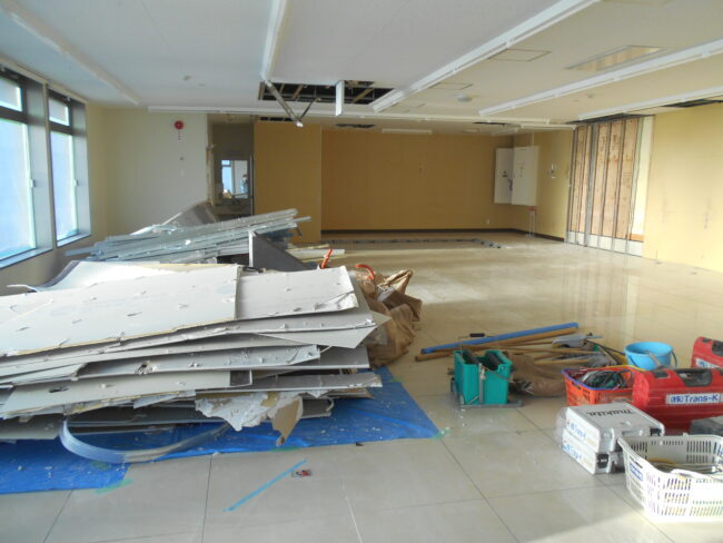 【10月11日】 ・間仕切解体 ・壁面解体 ・天井照明器具撤去 ・天井解体 ・各所集積及び清掃 【10月12日】 ・天井解体 ・配線処理 ・ゴミ出し ・各所集積及び清掃 【10月15日】 ・天…