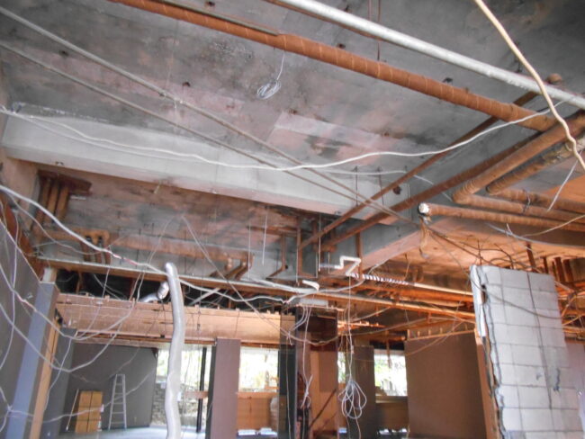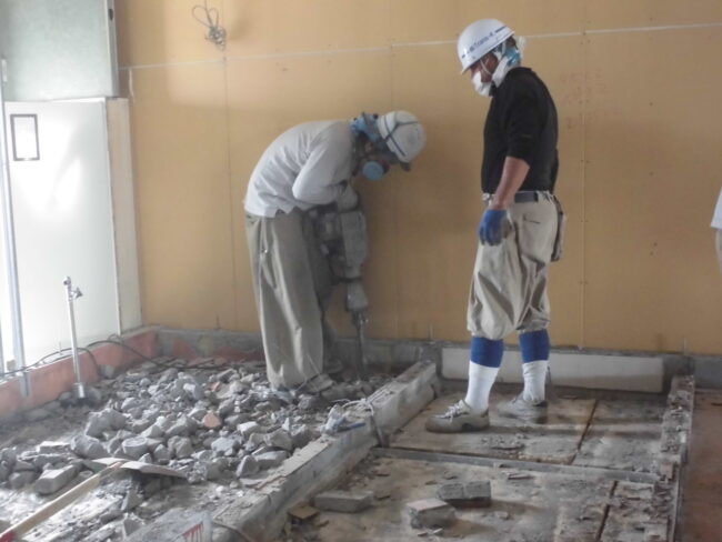 【6月5日】 ・間仕切り造作解体 ・足場部、ステージ、外部足場組み ・ファサード撤去 【6月6日】 ・厨房土間斫り ・壁面解体 ・ジプトーン一部生かし取り ・各所清掃 【6月7日】 ・土間斫り…