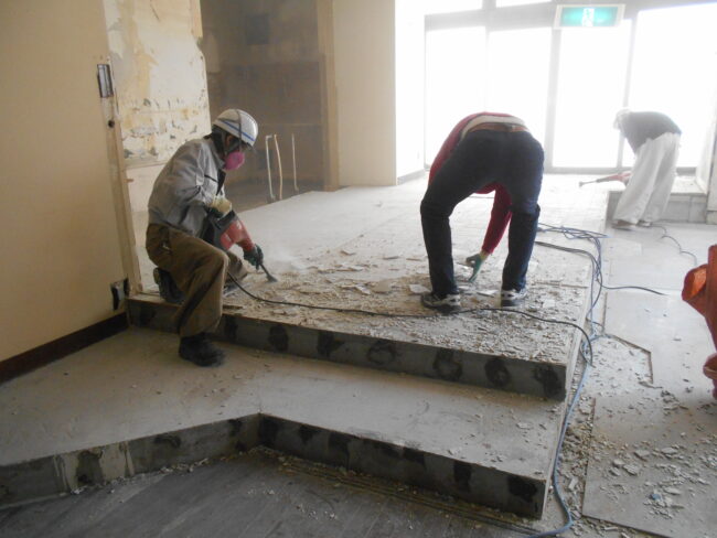 【3月28日】 ・間仕切り解体 ・造作物解体 ・床Pタイル解体 ・シール剥し ・マスカー目隠し養生 ・ゴミ出し、各所集積及び清掃 【3月29日】 ・タイル・シンダー土間斫り工事 ・床Pタイル剥し ・各所シー…