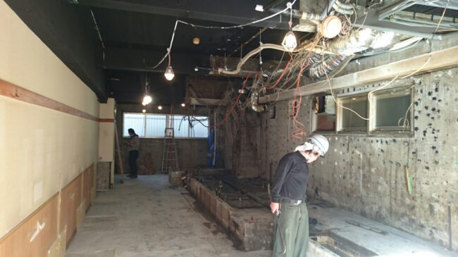 【1月19日】 ・2Fトイレ内タイル撤去、床下2重撤去、ケレンがけ ・1Fシャッター撤去、サッシ撤去、塩ビタイル撤去、ケレンがけ ・什器移動 【1月20日】 ・土間開口 ・2Fブロック解体 ・各所カッター入…