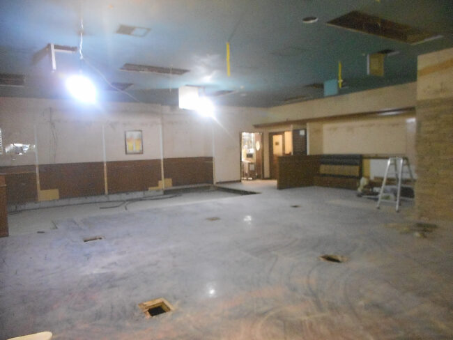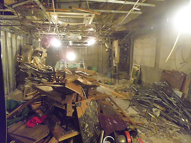 ・正面入り口・サッシ解体 ・壁タイル斫り・天井解体 ・屋上・室外機ダクトバラシ ・長尺剥し・壁解体 ・間仕切り壁解体 ・天井落とし ・床PPタイル剥し ・フェンス補修 ・看板撤去・穴コーキング補修 ・外部ダクト撤去 ・モ…