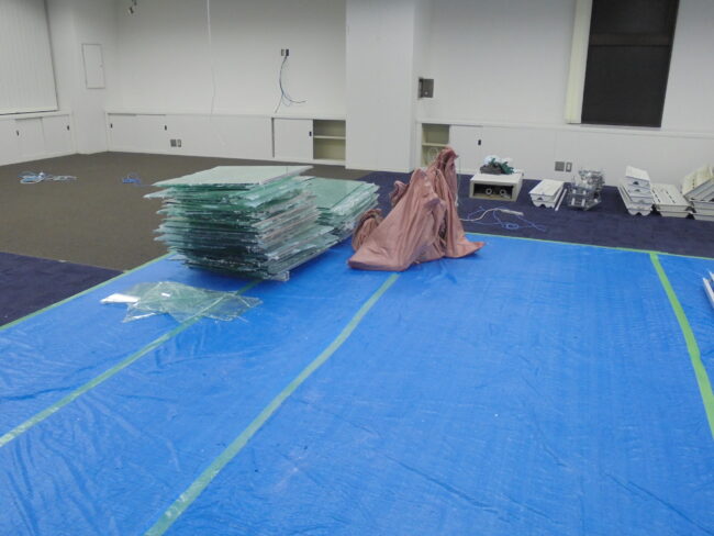 【10月23日】 ・ガラススチールパーテーション解体 ・ガラス小切り ・各所集積及び清掃 【10月24日】 ・スライディングレール解体 ・天井開口 ・各所養生、清掃 ・ゴミ出し
