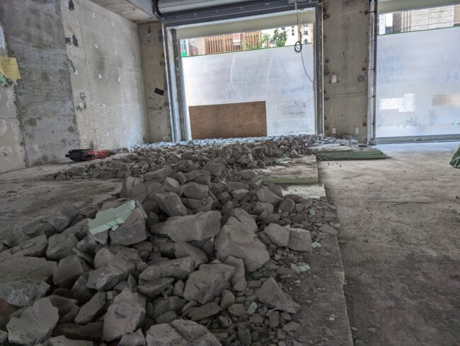 【7月9日】 ・間仕切解体 ・床CF撤去 ・外周壁解体 【7月10日】 ・間仕切解体 ・外周壁解体 ・タイル壁解体